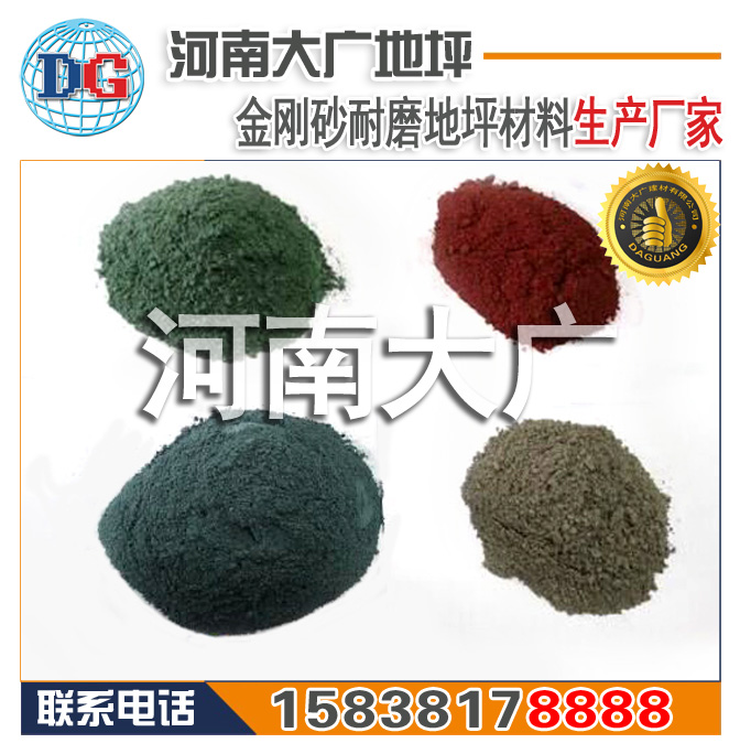 金剛砂骨料和石英砂骨料!本公司采用金剛砂骨料,金剛砂骨料比石英砂骨料硬度更高,效果更美觀!本廠作為河南省金剛砂源頭企業,目前全省大部分廠家的金剛砂骨料由本公司提供,其調配好的金剛砂地坪材料顏色又分水泥本色、綠色、紅色、藍色、黃色常用顏色金剛砂耐磨材料,其它顏色也可訂制生產。